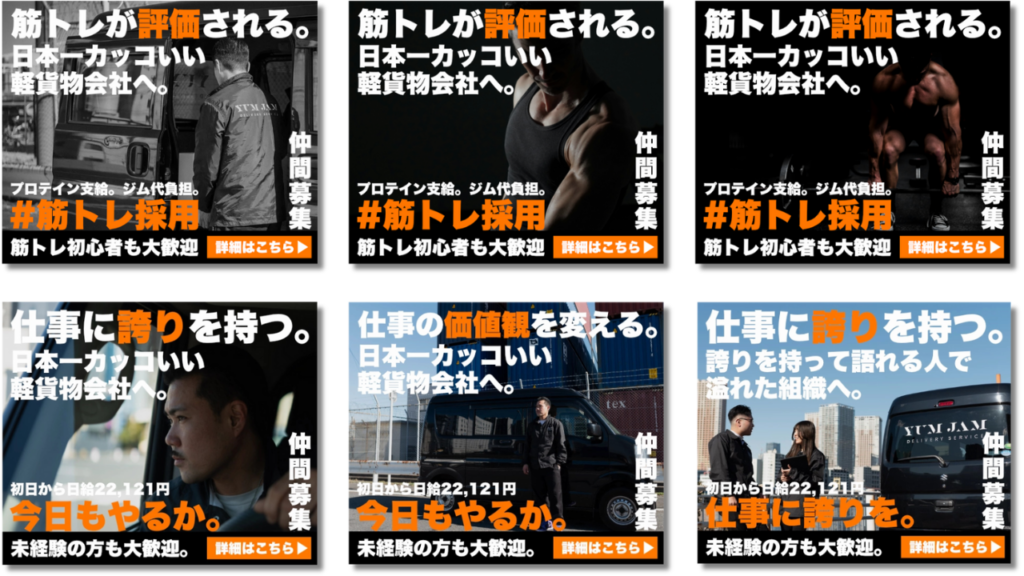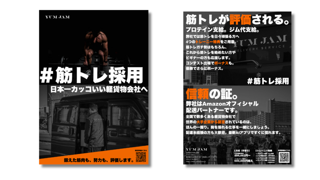 筋トレ採用をされている合同会社YUM JAM様の筋トレ採用サイトを制作させていただきました。採用サイトの他に、広告に使用するバナーであったり、チラシの制作も同時にご依頼いただきました。